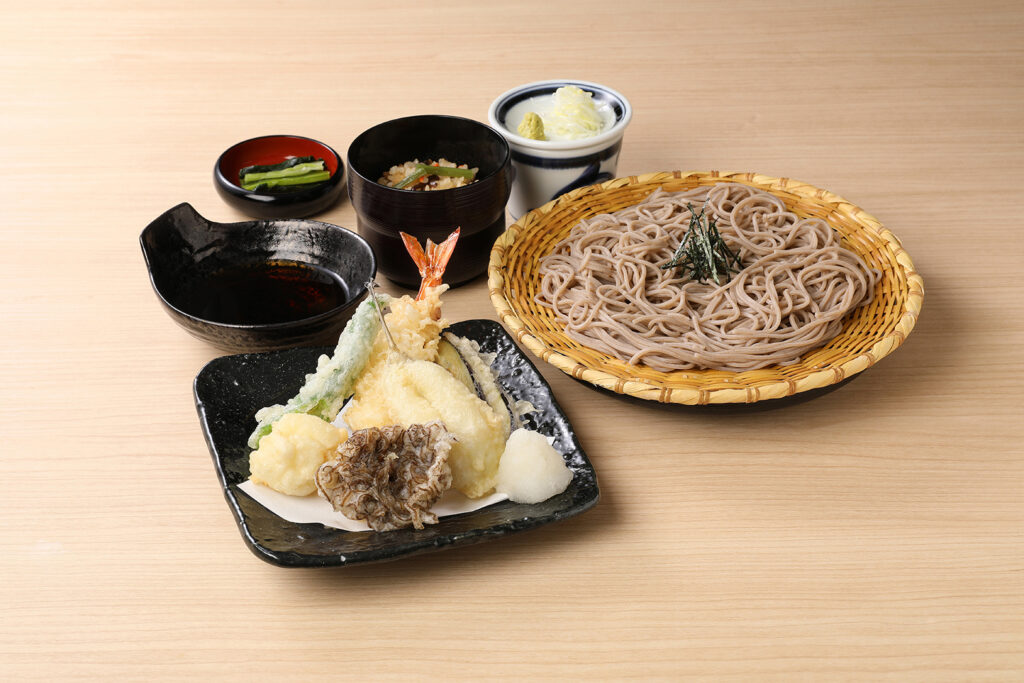 はも、めごち、万願寺唐辛子、もずく、季節の味覚を天ぷら盛り合わせに仕立てました。