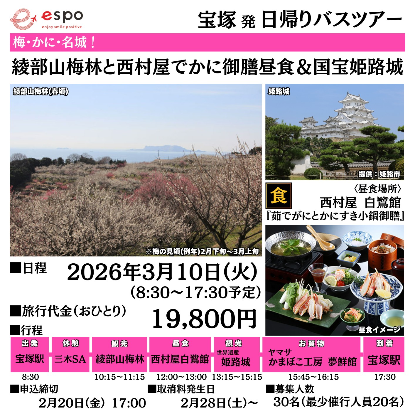 【JTB総合提携店えすぽツーリスト】🚌宝塚発着の春を感じる日帰りバスツアー ご予約受付中🌟 2026/01/23 SERVICE 🚌【日帰りバスツアー ご予約受付中!】🌟 宝塚駅発着 日帰りバスツアー新コースのご案内です。 📅 【えすぽオリジナルツアー】3月10日(火)開催 🚍 コース:綾部山梅林と西村屋でかに御前昼食&国宝姫路城 📍 行き先:綾部山梅林/西村屋白鷺館/姫路城 🍴 昼食:ゆでがにとかにすき小鍋御膳 💰 旅行代金(おひとり):19,800(税込) \ 心ほどける、春を感じる一日へ / ✅ 【先着限定】! 人気のコースなので、ご予約はお早めに📞 皆さまのご参加を心よりお待ちしております!