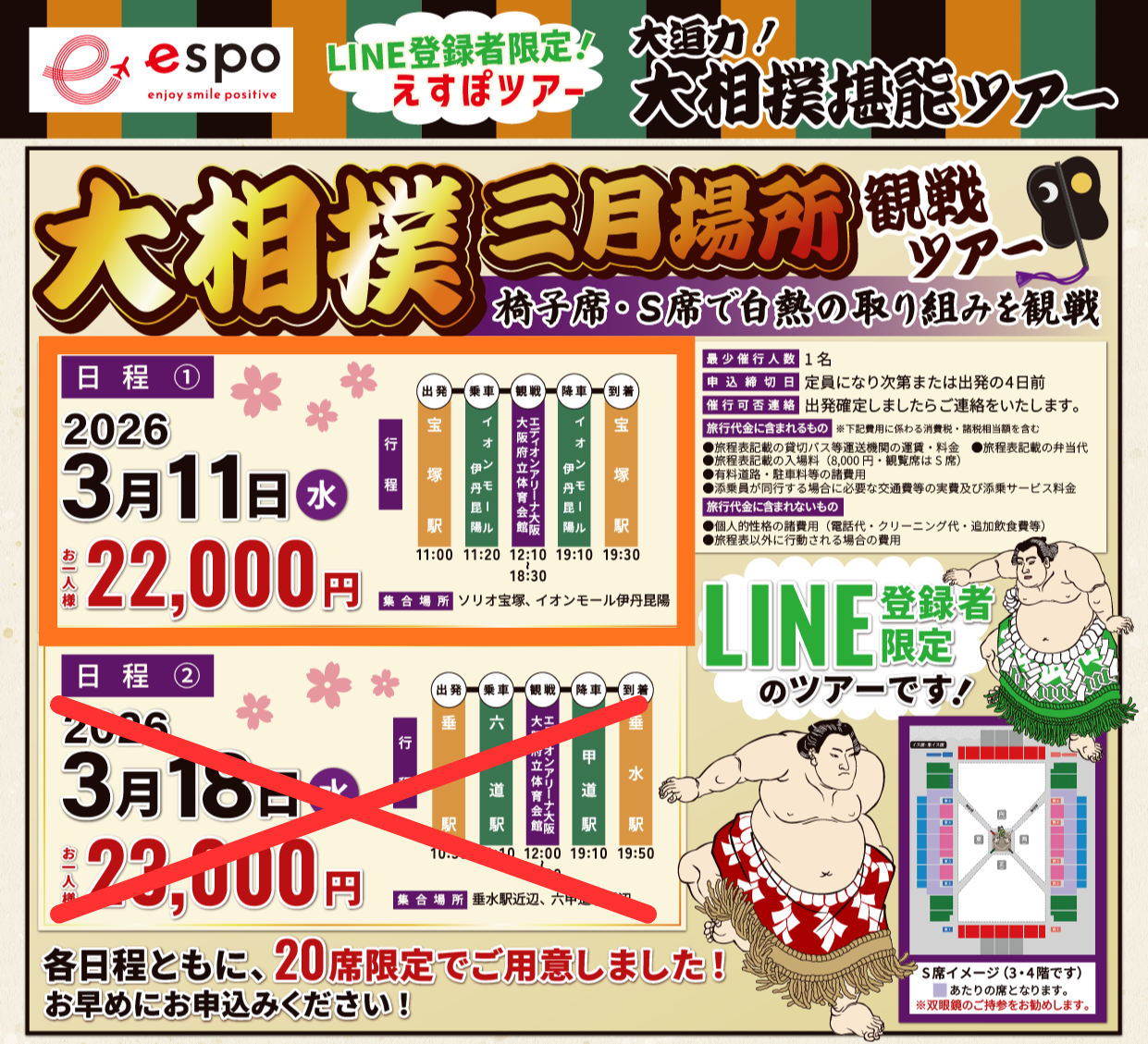 【JTB総合提携店 えすぽツーリスト】宝塚発着の大相撲三月場所観戦ツアー 2026/02/16 SERVICE 🚌残りわずか!【日帰りバスツアー ご予約受付中!】🌟 宝塚駅発着 日帰りバスツアー新コースのご案内です。 📅 【えすぽオリジナルツアー】3月11日(水)開催 🚍 コース:大相撲三月場所観戦ツアー 📍 行き先:大相撲三月場所(エディオンアリーナ大阪/大阪府立体育会館) 🍴お座席:椅子席(S席)3・4階 💰 旅行代金(おひとり):22,000円(税込) \宝塚駅発着のお弁当付で安心!大相撲を堪能!/ ✅ 【先着限定】! 大人気のコースなので、ご予約はお早めに📞 皆さまのご参加を心よりお待ちしております